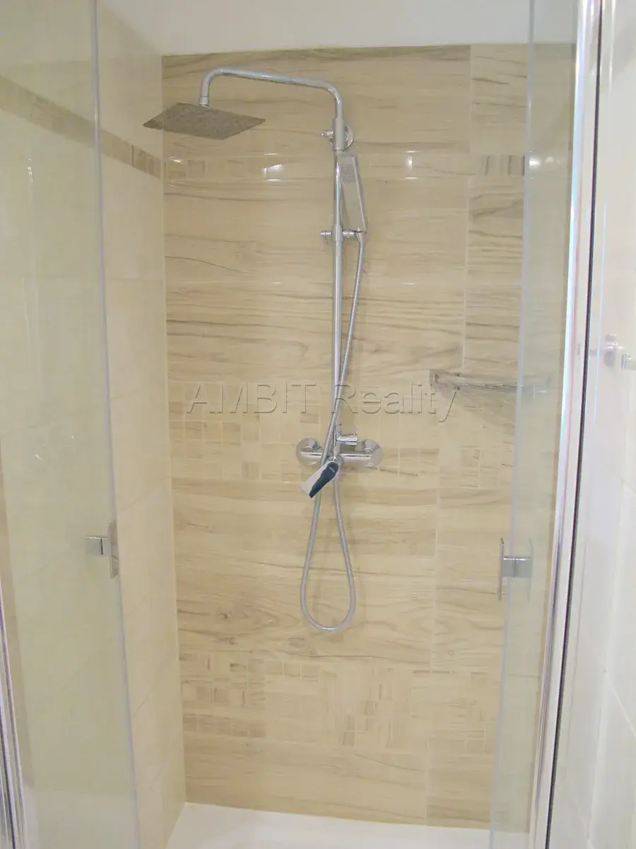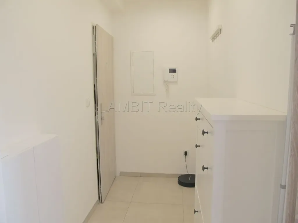 Byt sestává z menšího pokoje s kuchyňským koutem (kuchyň, nebo menší obývák) a druhého většího pokoje (ložnice, nebo větší obývák), dále byt sestává z koupelny s WC, předsíně a úložné komory v půdní vestavbě. Byt se prodává nezařízený, k dispozici zůstane vybavená kuchyňská linka a šatní skříně v ložnici. Kuchyňský kout je vybavený moderní kuchyňskou linkou se spotřebiči (sklokeramická indukční varná deska, elektrická pečicí trouba, samostatně stojící lednice s mrazákem). Z jednoho pokoje je výhled do klidného zeleného vnitrobloku a z druhého do dálky na celou Prahu. V koupelně se nachází umyvadlo, zděný prostorný sprchový kout, WC a přípojka na pračku. V koupelně a předsíni je podlahové topení.
