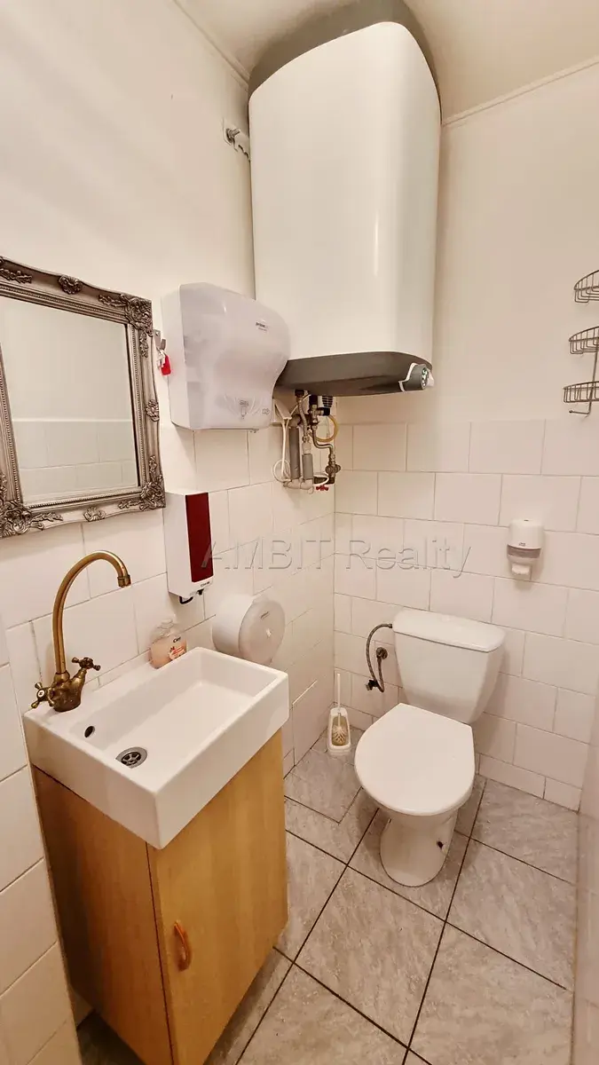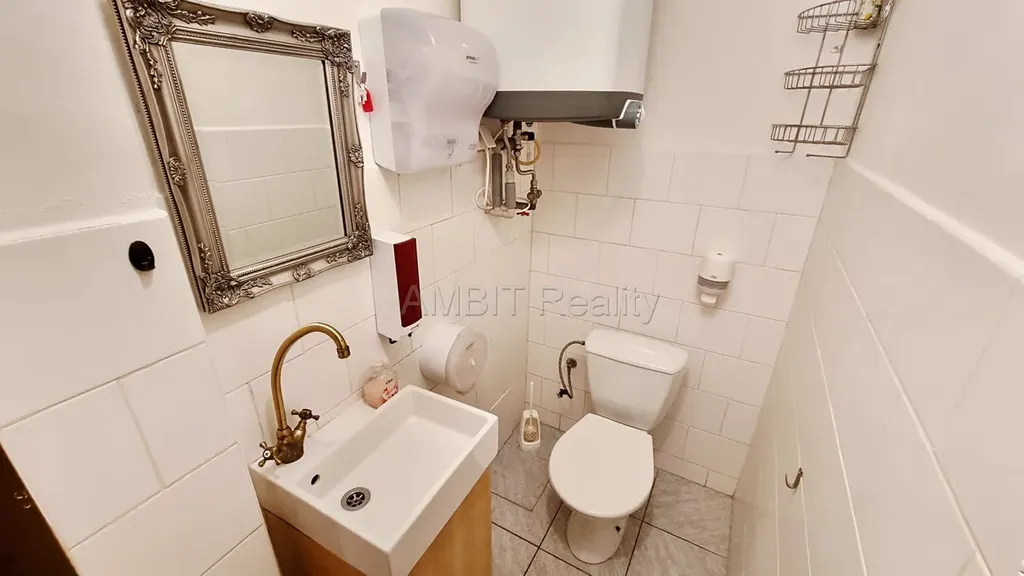 Tento nebytový prostor, vhodný například jako výrobna nebo výdejna občerstvení, provoz kadeřnictví, kosmetiky, masáží či jiné služby, výdejna zboží pro e-shopy, kancelář, vzorkovna, jednačka a pod., sestává ze vstupní předsíně, velké místnosti s kuchyňskou linkou a kancelářským koutem odděleným závěsem, menší samostatné místnosti s umyvadlem, WC s umyvadlem. Kromě vstupu přes vstupní předsíň, má prostor i přímý vstup z ulice-objektu. Podlahy jsou v hlavní místnosti plovoucí,, ostatní dlažba a koberec.