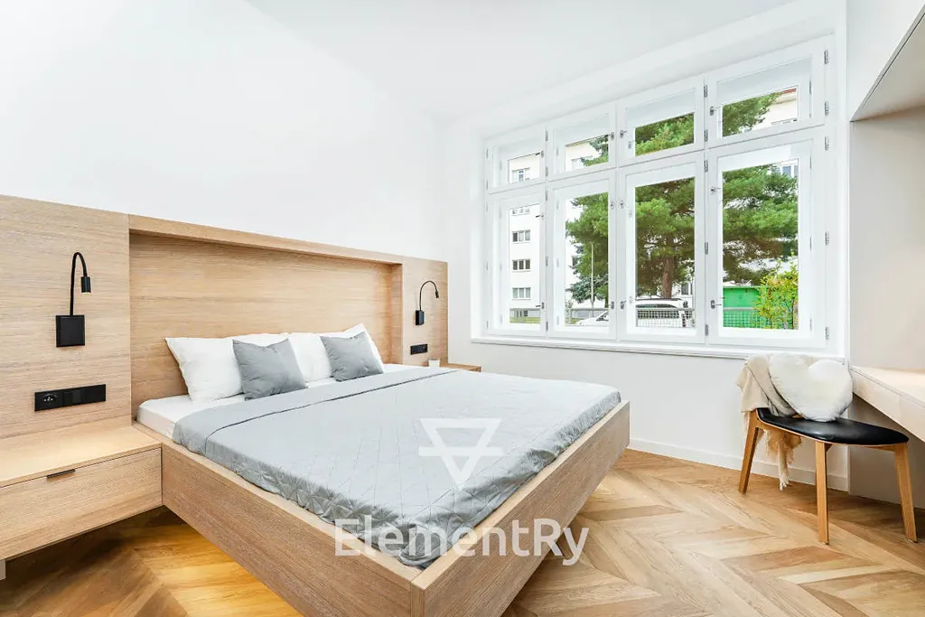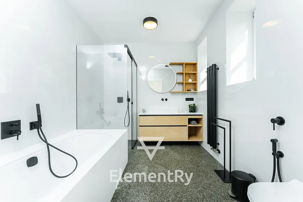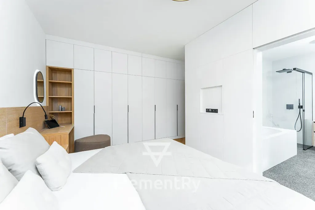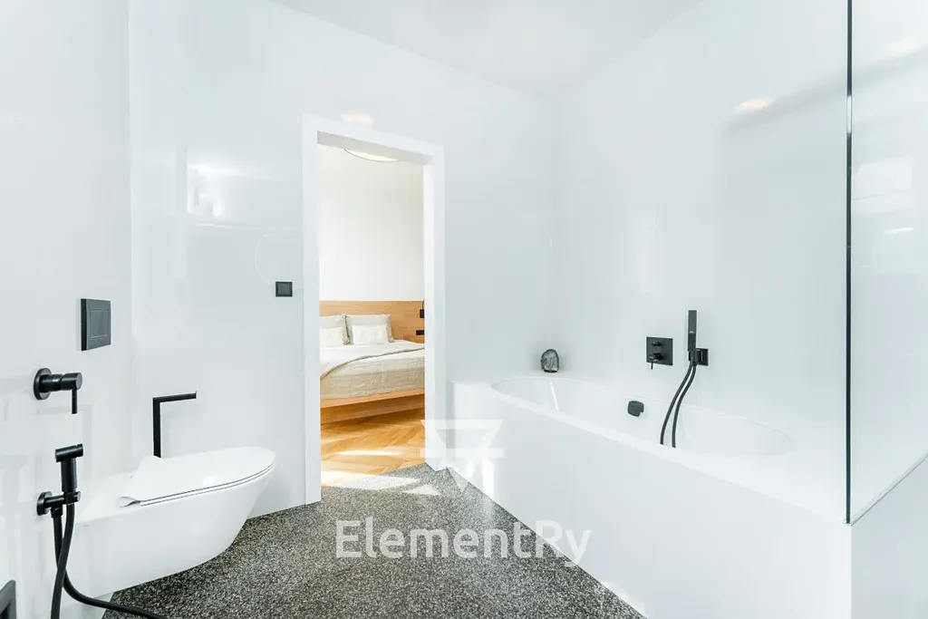 Celý byt je navržen v nadčasovém designu s použitím prémiových materiálů a poskytuje maximální komfort pro náročné klienty, kteří hledají reprezentativní a zároveň praktické bydlení.
