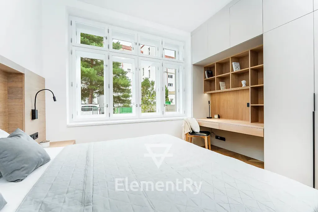 součástí interiéru je manželská postel s kvalitní matrací, noční stolky, vestavěné skříně a pracovní stůl