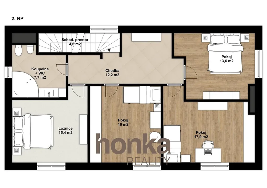 1. patro: tři pokoje, ložnice, koupelna s WC