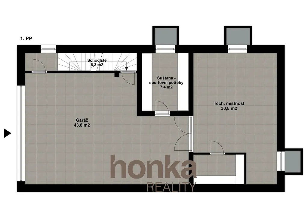 Suterén: garáž (43,8 m²), šatna, WC, technická místnost