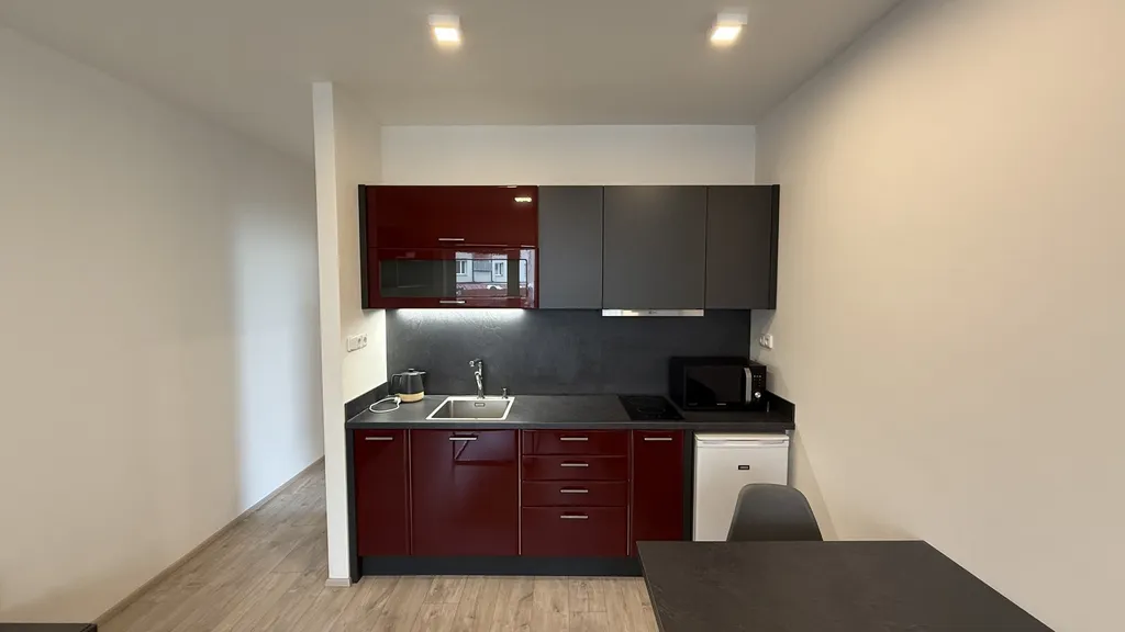 Pronájem zařízeného moderního bytu 2+kk, o podlahové ploše 30 m2, se sklepem (4m2), balkónem ( 5m2) a parkovacím stáním pod domem, v moderní novostavbě bytového domu na ulici Hřebíčkova, ve Zlíně - Malenovicích.