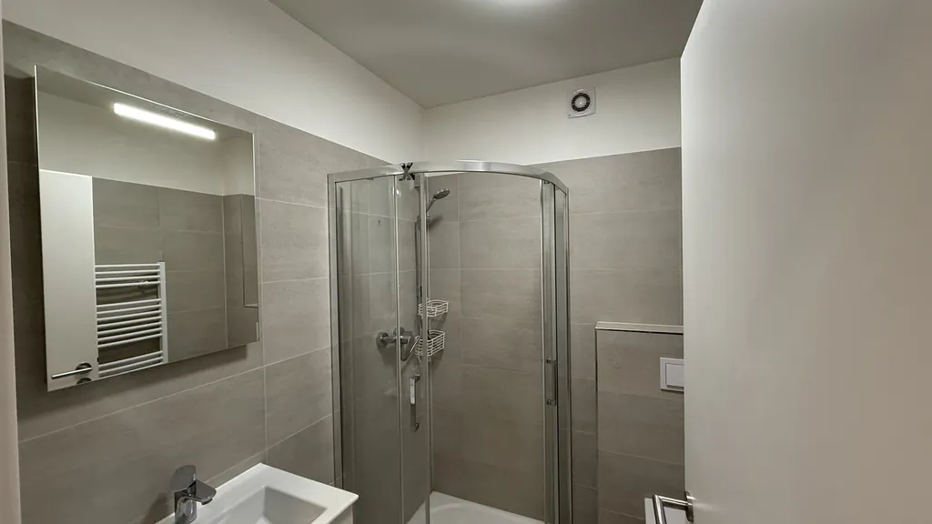 Na vstupní chodbě jsou úložné prostory pro kabáty, obuv i místo na přezutí. Koupelna má velmi prostorný sprchový kout, umyvadlo se zrcadlem, skříňkou, WC a k dispozici je i automatická pračka.