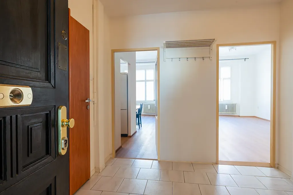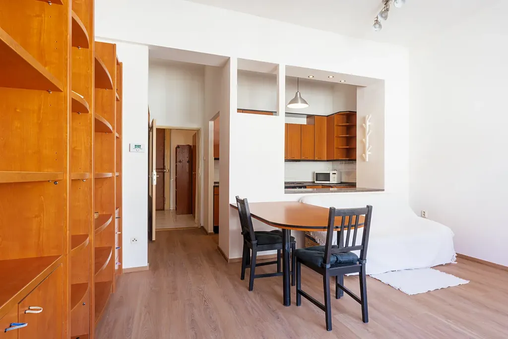 V bytě se nachází zařízení: knihovny, stůl, židle, botník, pohovka - lze ji odstranit.
