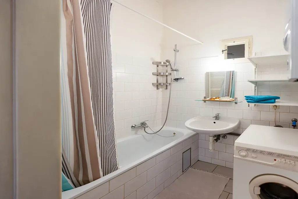 Koupelna je samostatná s vanou, umyvadlem, pračkou, topným žebříkem a WC je také samostatné.