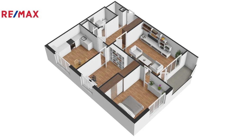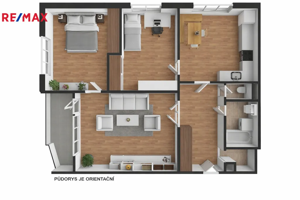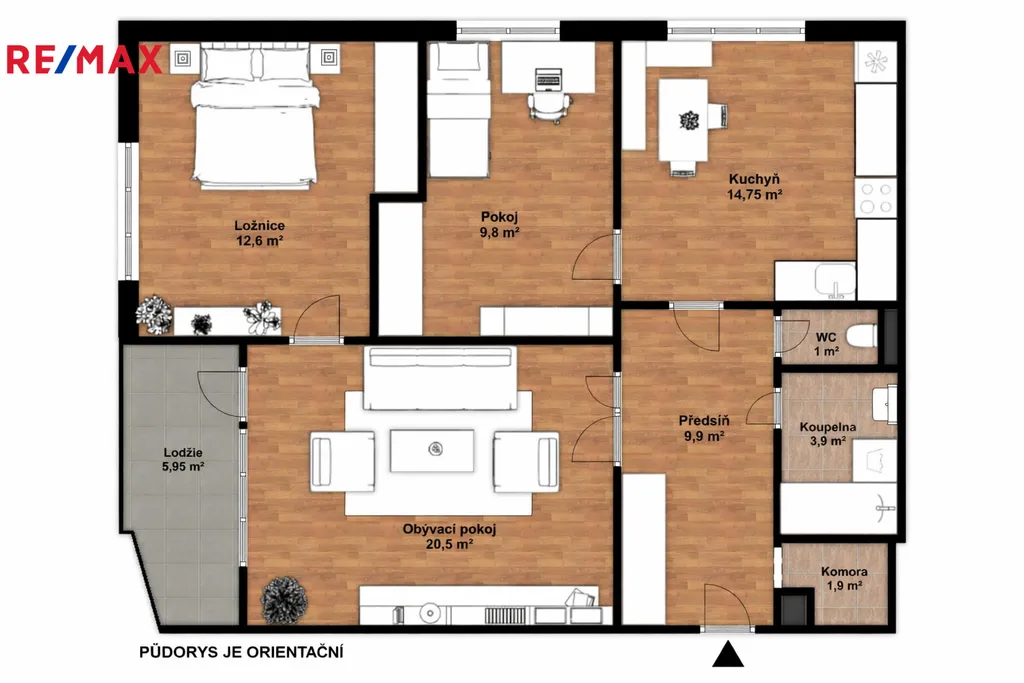 Praktická dispozice bytu s okny na dvě světové strany zajišťuje přirozené osvětlení všech místností. Kuchyň o ploše 14,75 m² a pokoj o velikosti 9,8 m² jsou orientovány na severozápad s výhledem do zeleně, zatímco obývací pokoj 20,5 m² a ložnice 12,6 m² směřují na jihozápad. Tato orientace přináší do interiéru dostatek odpoledního světla a umožňuje sledovat západ slunce přímo z prosklené lodžie o velikosti 5,95 m². Ložnice i druhý pokoj jsou navrženy tak, aby umožňovaly instalaci prostorných vestavěných skříní. Celou dispozici doplňuje velkorysá předsíň 9,9 m² s dalším úložným prostorem, která propojuje praktickou komoru 1,9 m² koupelnu 3,9 m² a samostatné WC 1,0 m². Byt je osazen plastovými okny. V obývacím pokoji, ložnici, pracovně i v předsíni jsou původní parkety. V kuchyni je položeno linoleum.