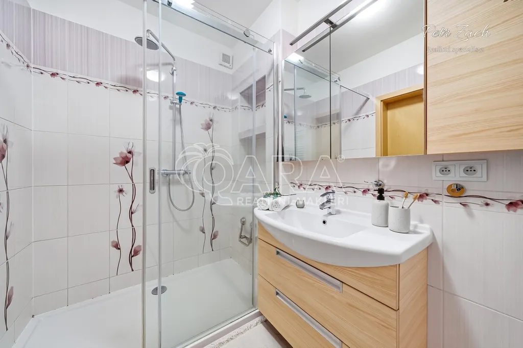 prostornou koupelnu s velkorysým sprchovým koutem,