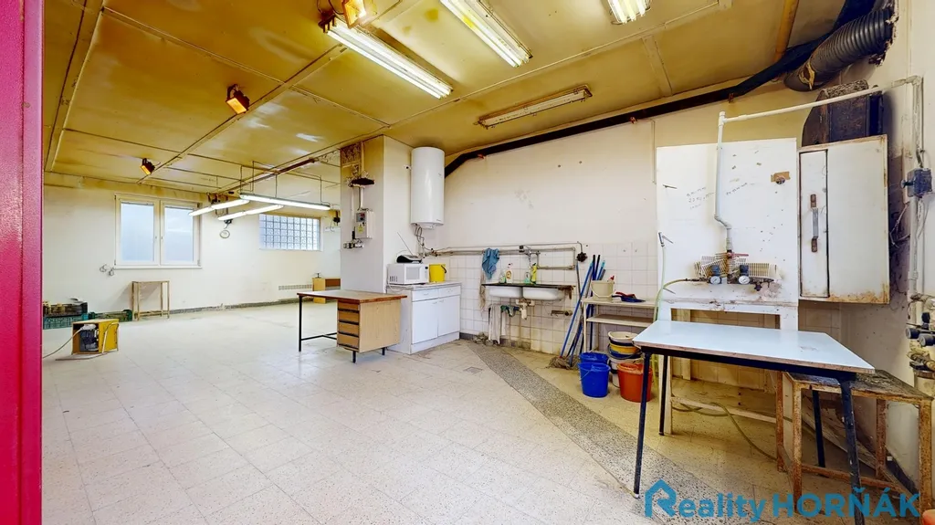 Hlavní budova nabízí tři výrobní haly (130,5 m², 105,1 m² a 138,5 m²), navazující skladové prostory (22,8 m² a 24,4 m²), administrativní zázemí (kancelář 16,5 m²) a sociální část tvořenou kuchyňkou (14,0 m²), šatnou (16,2 m²), dvěma koupelnami (6,6 m² a 5,7 m²), třemi WC a chodbou (12,3 m²). Vedlejší objekt tvoří samostatná hala o výměře 126,4 m² a navazující sklad 30,2 m². Tento prostor je vhodný jako technický sklad, manipulační zázemí nebo oddělená provozní část.