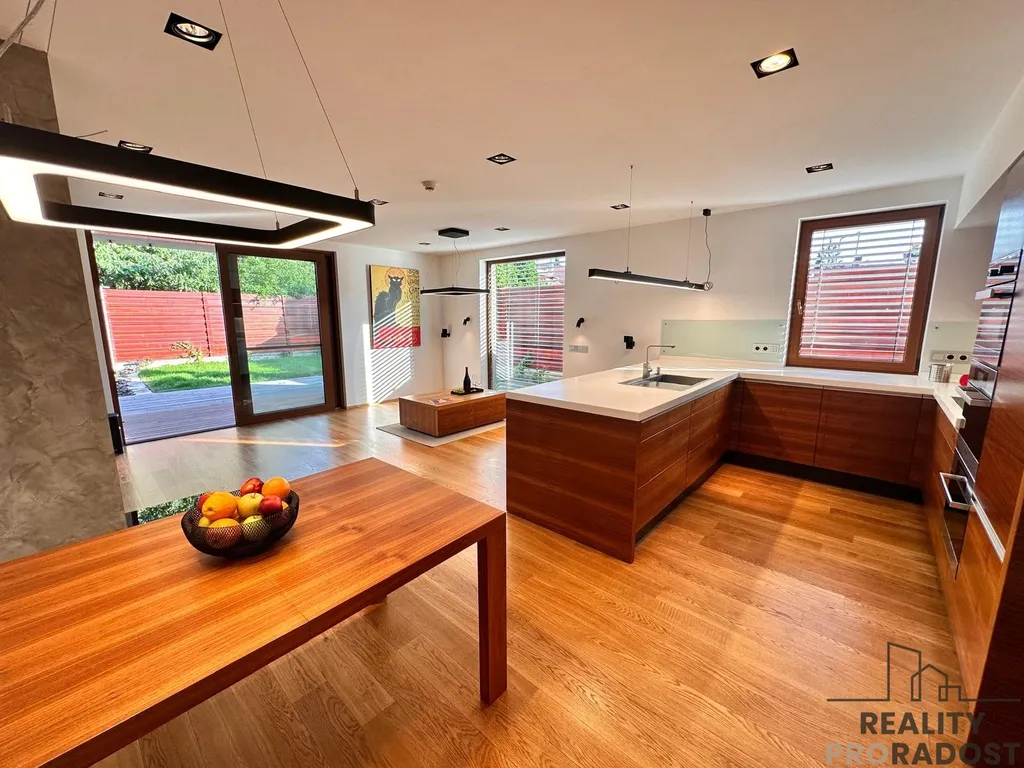 Designový dýhovaný dřevěný nábytek včetně veškerých kuchyňských spotřebičů značky Miele a Siemens, velkoplošná televize