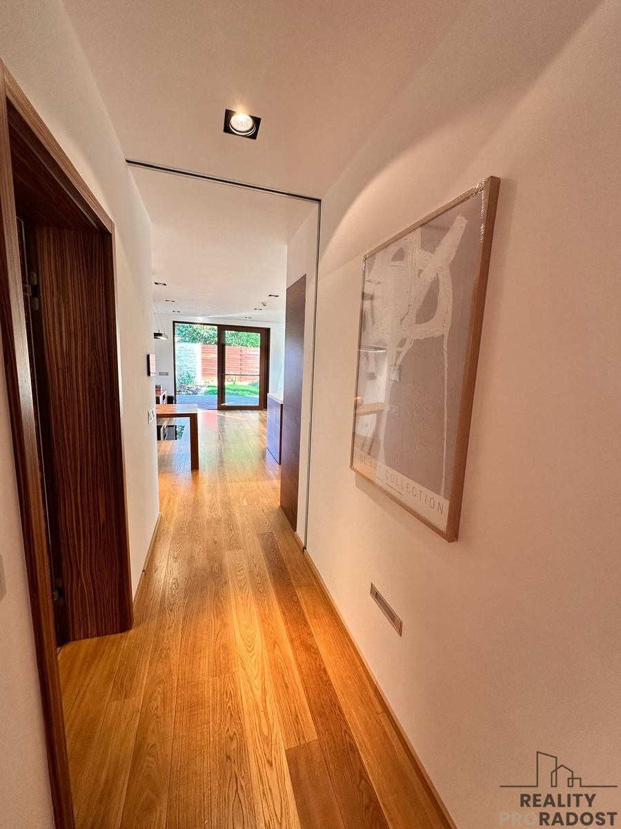 Dispozice bytu velikosti 3+kk včetně terasy se zahradou je znázorněna na přiloženém plánu bytu. Podlahová plocha bytu je 83,6 m2. Zahrada je přístupná také přímo z venkovního prostoru a není tak nutné projít interiérem bytu. V suterénu domu je k dispozici sklep o velikosti 2,3 m2. Součástí spoluvlastnictví je také plocha pro parkování vozidel k užívání krytého garážového stání o velikosti 12,5m2 a venkovního stání na nádvoří domu. Dvůr je uzavřený, přístupný brankou a pro vjezd vozidel je instalovaná automatická vjezdová brána na dálkové ovládání. Bytová jednotka působí výjimečně, je nadstandardně vybavena a může být rovnocennou alternativou za rodinný dům pro zájemce s vysokými požadavky na uživatelský standard a soukromí. V bytě byla aktuálně dokončena renovace podlah, nábytku, terasy, oprava omítek, provedena malba, výměna některých spotřebičů, nové osvětlení a výsadba zahrady.