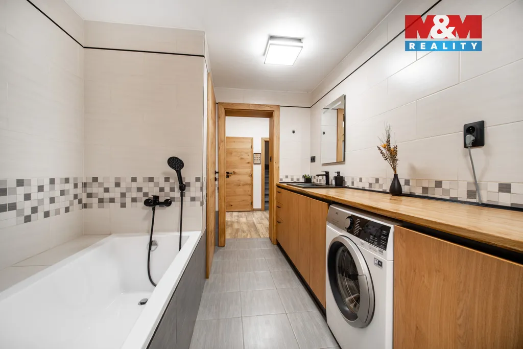 V patře jsou umístěny další obytné místnosti – ložnice, dětský pokoj se vstupem na balkón a šatna. Horní část domu je určena k částečnému dokončení, což nabízí možnost úprav dle vlastního vkusu.
