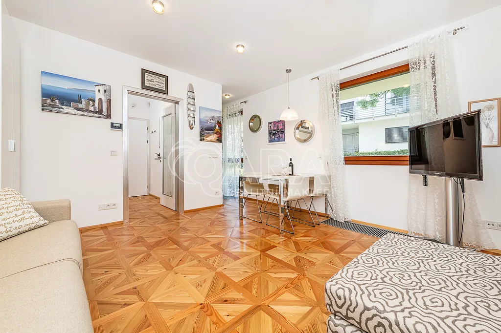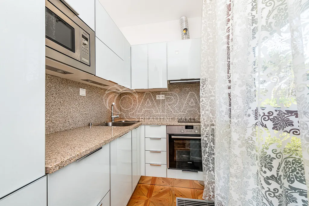 Interiér bytu je v nadstandardním provedení – dřevěné podlahy, podlahové vytápění v koupelně, bezpečnostní vstupní dveře s videotelefonem, interiérové dřevěné dveře značky Sapeli, vestavěné skříně a praktické úložné prostory. Kuchyňská linka je vybavena veškerými spotřebiči. Nábytek na fotkách je součásti ceny bytu.
