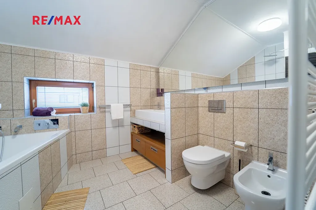 Do patra pak vedou pohodlné schody s podestou. V patře se nachází dva velkorysé dětské pokoje každý s výměrou 24 m2, ložnice s terasou a menší pokoj, který může sloužit jako pracovna či šatna. Koupelna je opět prostorná, je v ní umístěn nový plynový kondenzační kotel, který zajišťuje vytápění domu a ohřev vody.