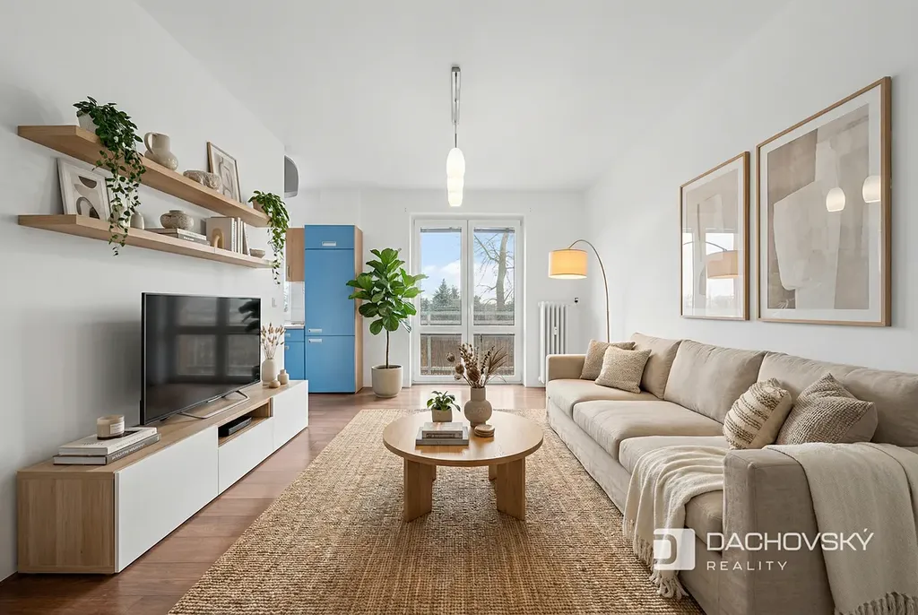 Dispozice 2+kk nabízí praktické uspořádání prostoru. Byt je obyvatelný, nicméně nový majitel musí počítat s postupnou modernizací interiéru. Zejména podlahové krytiny, kuchyňská linka a část technického zázemí již neodpovídají současným standardům a do budoucna si vyžádají úpravy.