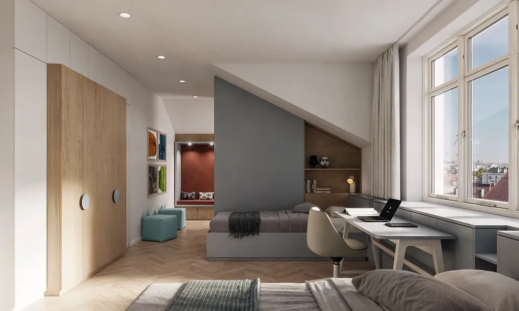 Půdní nástavba šesti nových bytů v dochozí vzdálenosti od metra Pražského povstání.