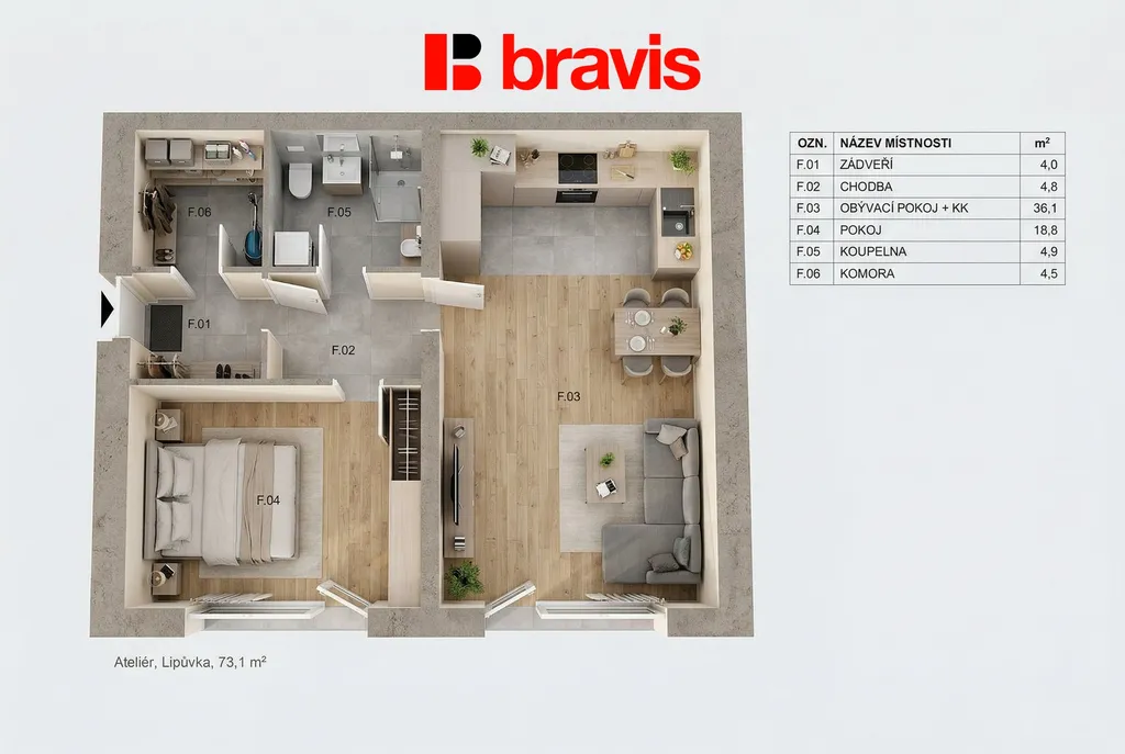 Přesně takové možnosti nabízí prostor tohoto krásného ateliéru v právě dokončovaném polyfunkčním komplexu Lipůvka! Ateliér nabízí velkorysý obývací pokoj s kuchyňským koutem o vel. 36,1m², pokoj (18,8m²), komoru/šatnu (4,5m²), chodbu, dostatečně prostornou na uložení věcí a koupelnu s toaletou (4,9).
