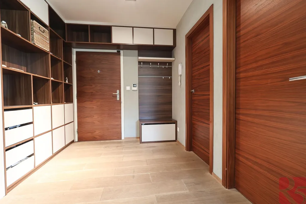 Dominantou bytu je prostorný obývací pokoj (přes 40m2) s přímým vstupem na velkou dřevěnou terasu z exotického dřeva (massaranduba), v létě zastíněná hliníkovou bioklimatickou pergolou. Na terasu je vstup i z ložnice a dětského pokoje. Okna bytu na jihovýchod.