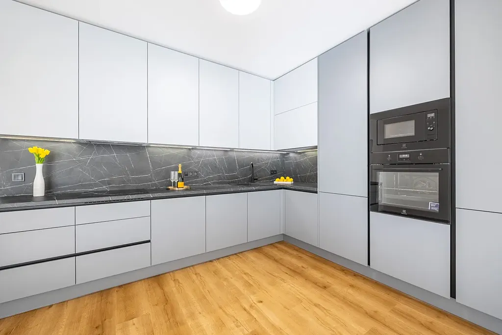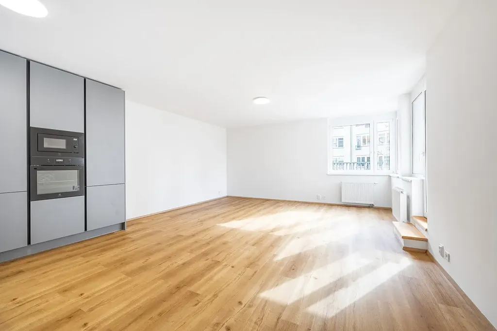 Kuchyně je vyrobena na míru a kompletně vybavená spotřebiči (elektrická trouba, mikrovlnná trouba, indukční deska, myčka). Kuchyně je velkorysá s důrazem na dostatek úložných prostor a pohodlí při každodenním využívání. Velký obývací pokoj s kuchyní je dominantou tohoto bytu. Součástí bytu je také prostorná šatna a velká chodba s možností vybudování dalších úložných prostor. Garážové stání se pak nachází jen pár kroků od výtahu.