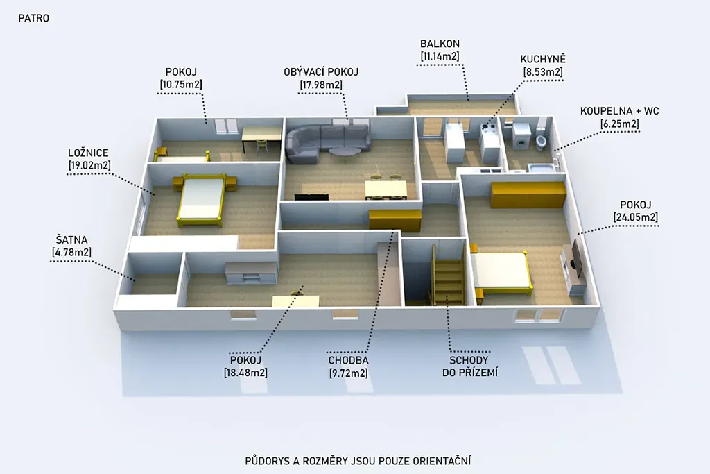 • Sklep po celé ploše domu, který poskytuje dostatek úložného prostoru.