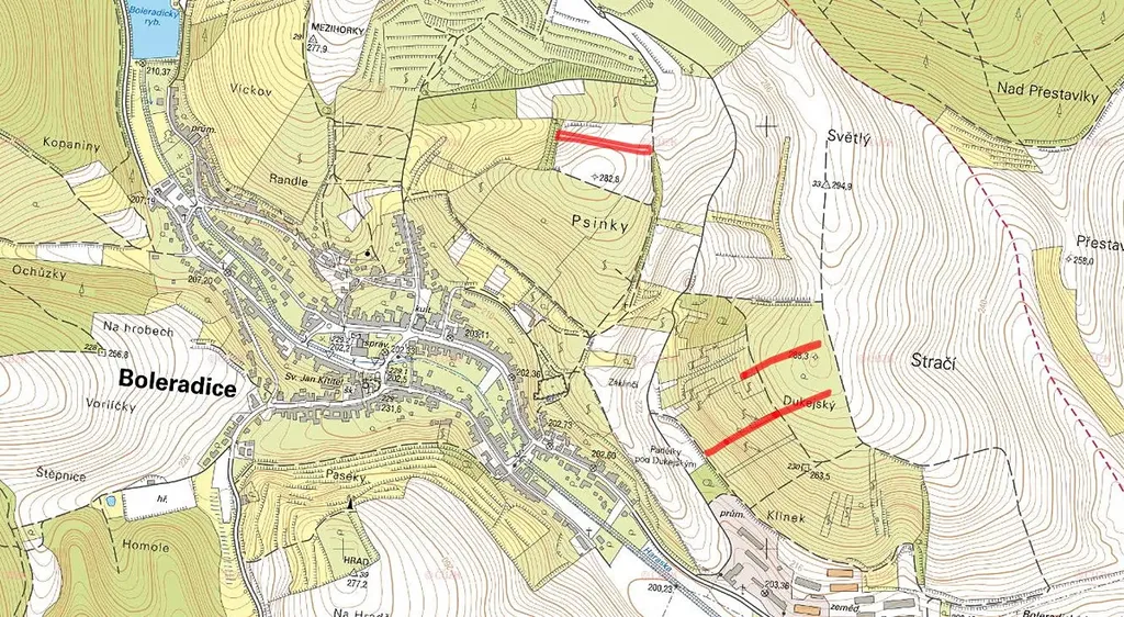 Pozemky jsou situovány západně od obce Boleradice a mají celkovou rozlohu 6 736 m2. Jsou zapsány na LV 650 parc. č. 2331, 1939/95, 1939/77, 1939/40, 1939/24, 1900/3 a 1900/2. Částečně jsou vedeny jako vinice (3 835 m2) a částečně jako ovocný sad (2 448 m2).