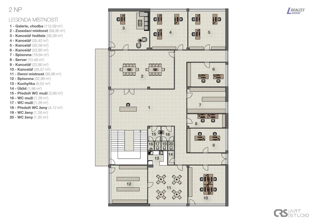 V první patře areálu se nachází cca 300 m2 kancelářských prostor a příslušenství: oddělení nákupu, oddělení kvality, vedoucí výroby, kancelářské místnosti, spisovna, zasedací místnost, serverovna, kuchyňka atd.