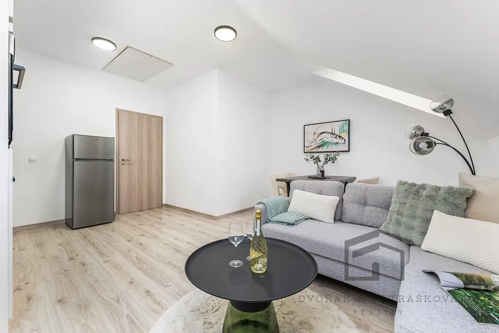 Zrekonstruovaný byt 2+kk 40 m2 (podlahové plochy) s půdním prostorem 10 m2 (užitné plochy), se nachází ve 3.patře cihlového domu BEZ výtahu. Byt prošel rekonstrukcí a je vhodný pro jednotlivce nebo pár. Bytová jednotka disponuje vstupní chodbou s oddělenými vstupy do jednotlivých pokojů. Obývací pokoj s kuchyňským koutem je vybavený myčkou, horkovzdušnou troubou, indukční varnou deskou, digestoří, dostatkem úložného prostoru a samostatně stojící lednicí s mrazákem. Součástí prodeje je i veškerý nábytek na fotografiích. Výška stropu je 2,6 m2. Z obývacího pokoje je přístup na půdu, kterou lze využívat jako úložný prostor - zde jsou nízké stropy a chybí odvětrávání (nelze využívat jako pracovnu).