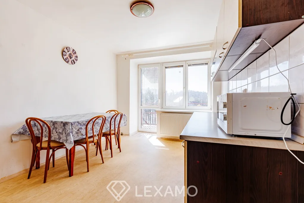 Dispozice zahrnuje obývací pokoj, dvě ložnice, kuchyň, koupelnu a samostatné WC. Součástí bytu je také prostorný balkon, který poskytuje příjemné místo k odpočinku.