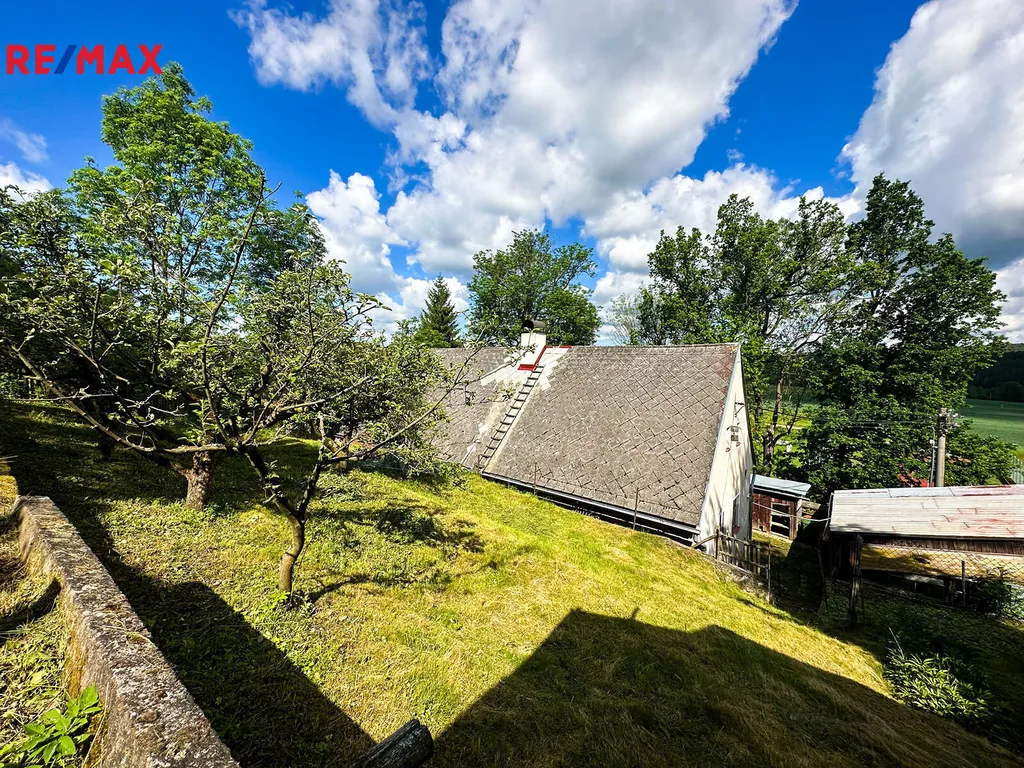 Tento dům stojí na terasovité zahradě, která sama vybízí k tichému rozjímání a posezení s výhledem do širého kraje. I když zahrada nyní čeká na nového pěstitele, její půda je stále bohatá a úrodná – právě zde rostou jedny z nejlepších maliňáků v celé obci. Jako dům pro hosty, ateliér či místo pro relax pod širým nebem se nabízí zahradní domek s kamny v horní části zahrady. Fantazii se meze nekladou.