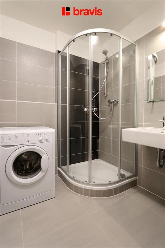 Koupelna (3,7 m²) je se sprchovým koutem, umyvadlem, otopným žebříkem, pračkou a toaletou.
