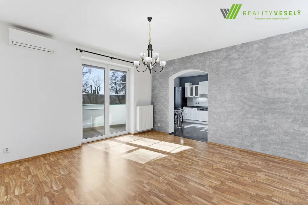 Dominantou bytu je velkorysý obývací pokoj, který je stylově propojen s plně vybavenou kuchyní a jídelním koutem. Otevřený prostor působí vzdušně a příjemně, navíc s přímým vstupem na terasu. Komfort v letních měsících zajišťuje klimatizace umístěná v obývacím pokoji.