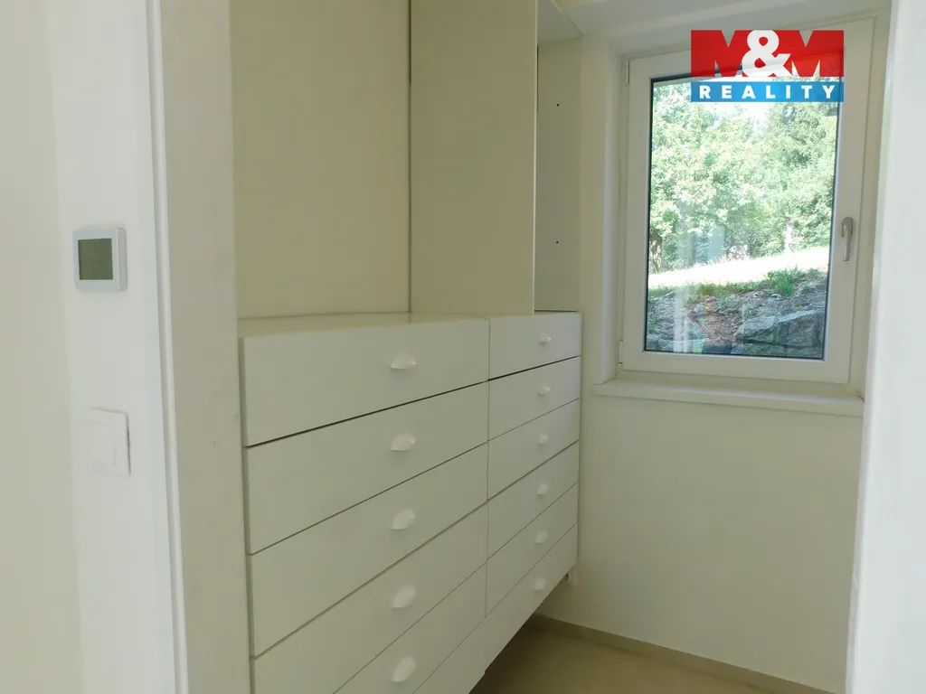 Prakticky řešenému domu dominuje obývací pokoj s otevřeným prostorem a interesantní vestavbou do štítu, kuchyňskou linkou s elektrospotřebiči, krbem a vstupem na terasu. Dále disponuje menší pracovnou, koupelnou s vanou i sprchovým koutem, samostatnou toaletou, prosvětlenou ložnicí s šatnou a vstupem na terasu.