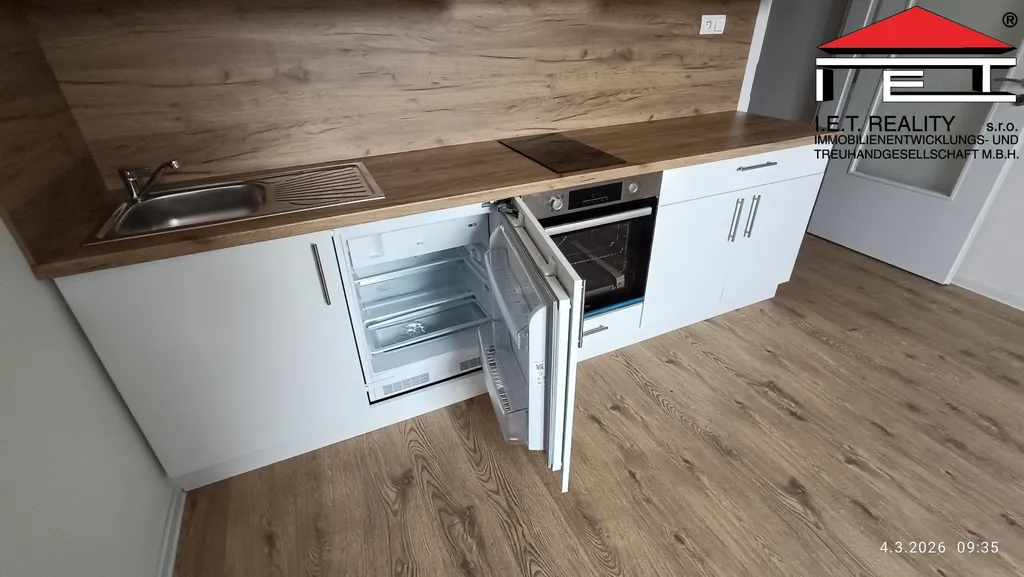 V bytě je moderní kuchyňská linka s el. varnou deskou, troubou a lednicí.