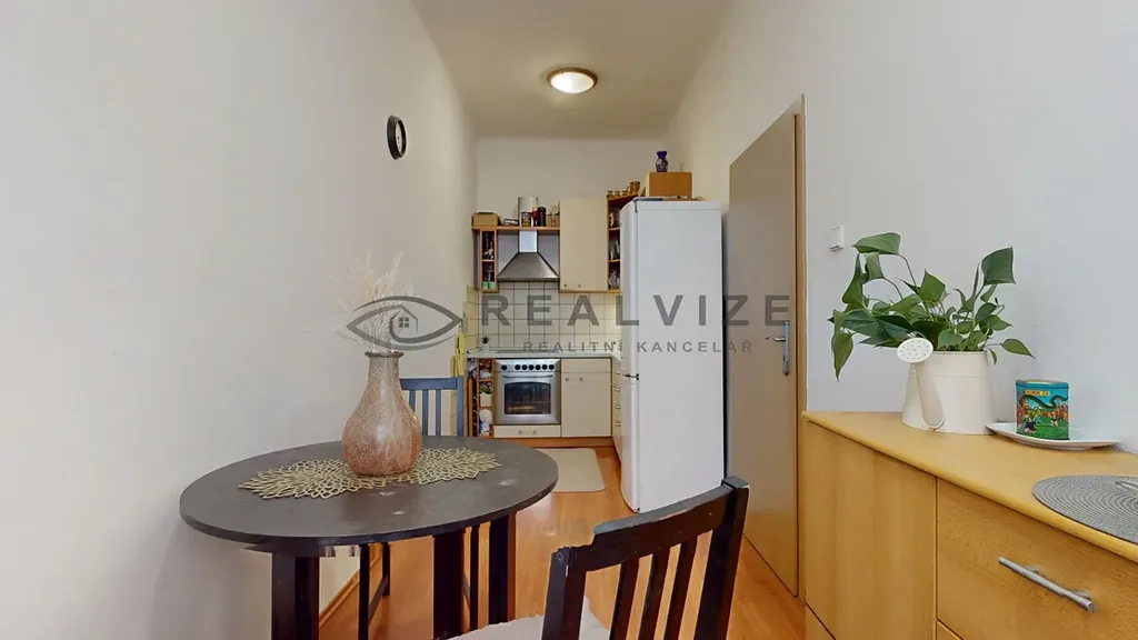 Dispozice zahrnuje prostorný obývací pokoj s patrem na spaní a pracovní zónou, oddělenou kuchyňskou část s místem pro jídelní stůl, koupelnu se sprchovým koutem, toaletou a místem pro pračku a vstupní chodbu s úložným prostorem. Díky své poloze v centru města je veškerá občanská vybavenost v bezprostřední blízkosti a výborná dopravní dostupnost umožňuje pohodlný pohyb po celých Českých Budějovicích. Byt je ideální pro ty, kteří chtějí žít v živém centru, ale zároveň hledají klidné a příjemné bydlení.