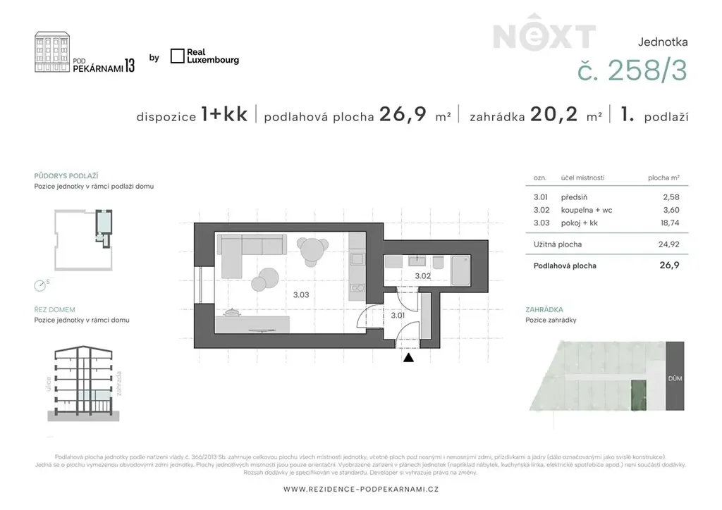 Rád bych Vám v rámci výhradního zastoupení developera představil byt 1+kk o podlahové ploše 26,9 m² v citlivě rekonstruovaném projektu Rezidence Pod Pekárnami 13, situovaném v klidné části Prahy 9. Byt se nachází ve 1. nadzemním podlaží, je orientovaný na severozápad, směrem do dvora a jeho benefitem je soukromá zahrádka o výměře 20,2 m².