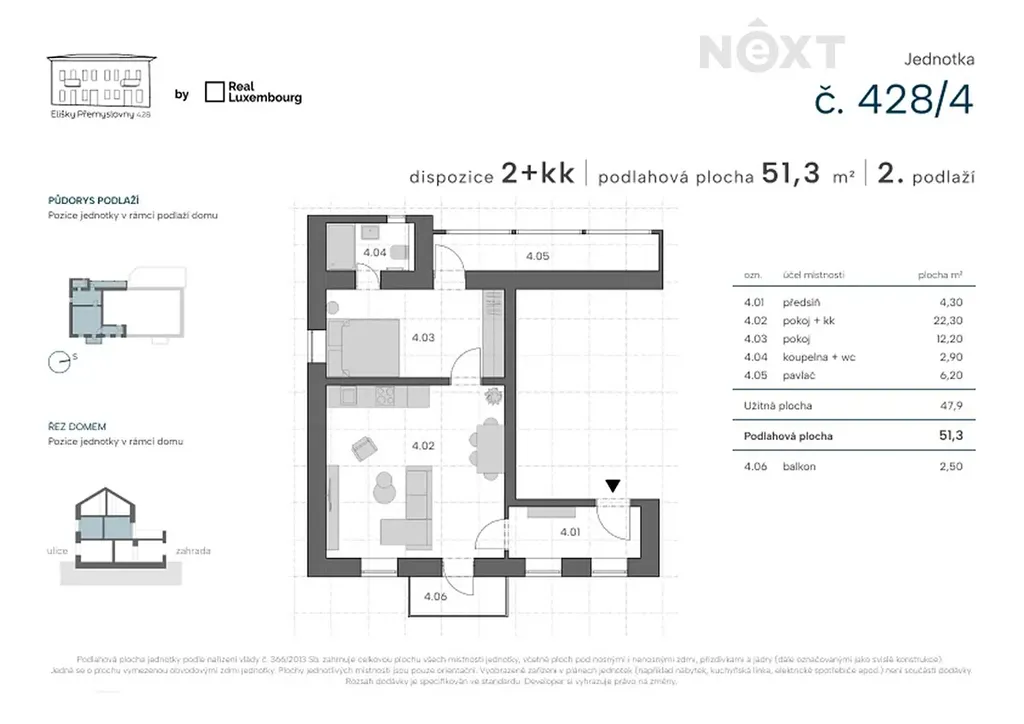 Moderní a prostorná jednotka o dispozici 2+kk (51 m²), balkonem (2,5 m²) a zasklenou pavlačí (6,5 m²).