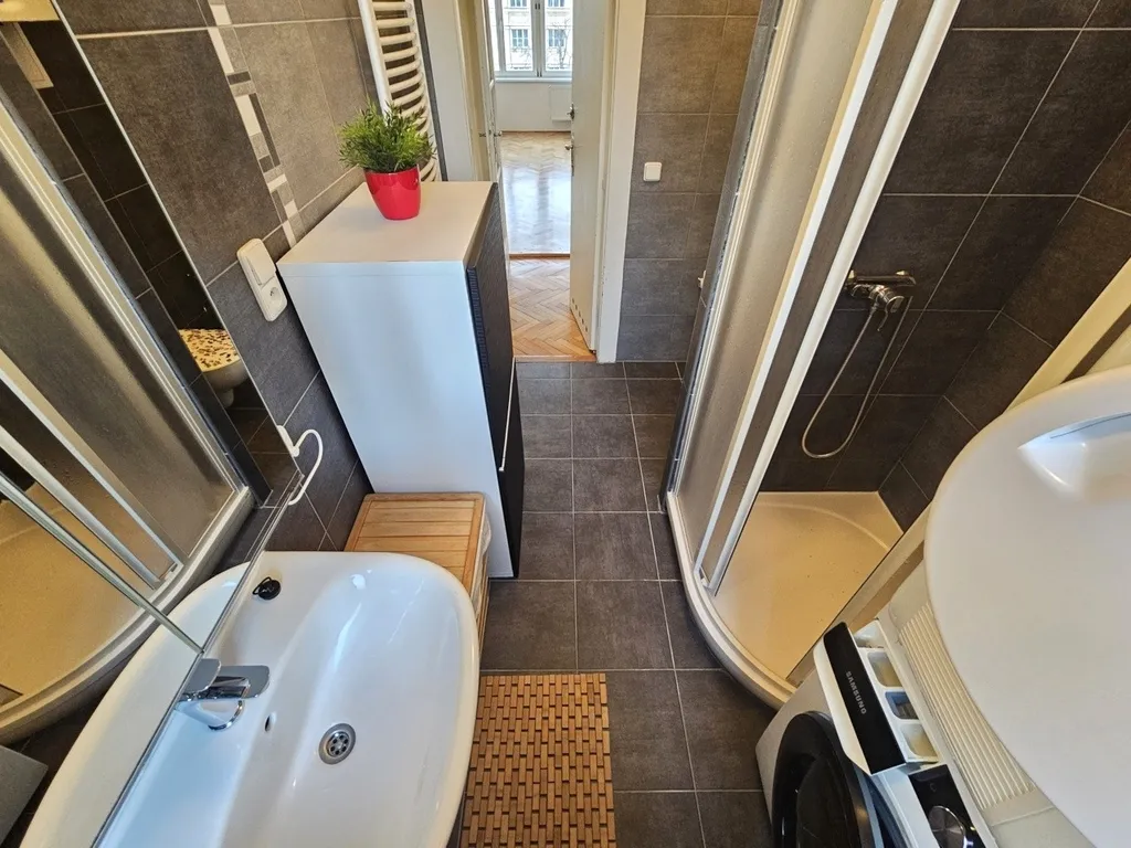 K bytu náleží velkorysé úložné prostory - sklep 6 m2 (v suterénu) a samostatný uzamykatelný úložný prostor na půdě 9 m2 (v 5.patře). V suterénu domu je možné si pronajmout 1 garážové stání za 4.500 Kč měsíčně.