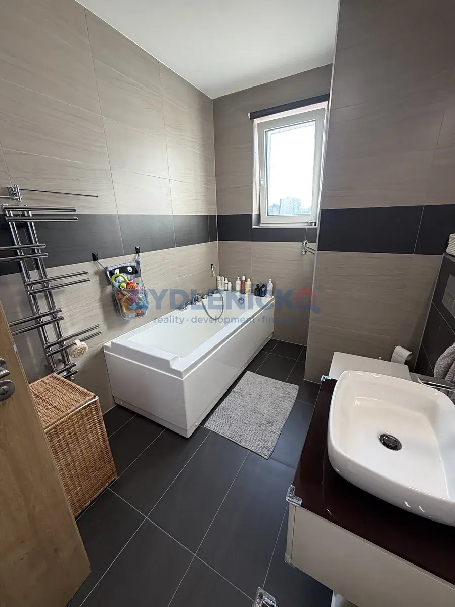 Dispozice – do bytu se vchází prostornou předsíní o velikosti 8,2 m2, kde je místo na vestavěnou skříň či botník. Z této chodby je samostatný vstup do obýváku, ložnice a koupelny. Obývací pokoj s kuchyní má výměru 33,57 m2 a je vybaven kvalitní kuchyňskou linkou se zabudovanou myčkou. Ložnice má výměru 21,71 m2 a je zde místo jak pro velkou šatní skříň, tak malou pracovnu či prostor pro další realizaci. Po pravé ruce je vstup do prostorné koupelny o velikosti 7,09 m2 s dvojumyvadlem a vanou, kvalitními zařizovacími předměty, vývodem na pračku a závěsným záchodem. Velkou výhodou je také okno, díky kterému je možnost v koupelně přirozeně větrat. Zděný sklep v patře nabízí dostatek prostoru pro uskladnění věcí.