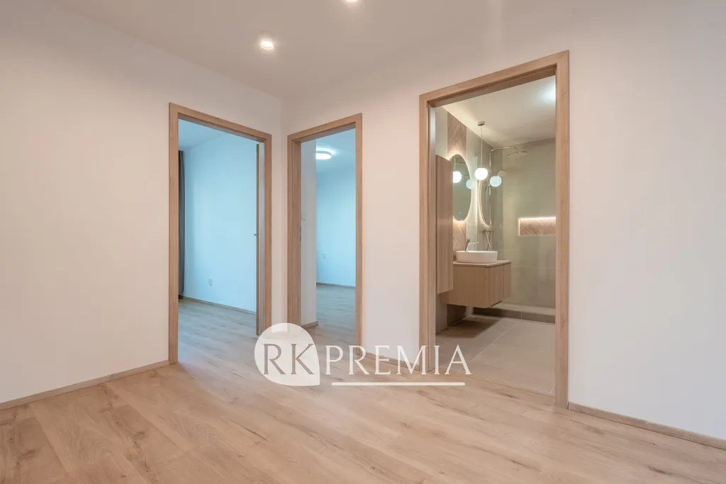 Koupelna? Nadstandardně prostorná. Sprchový kout, závěsné WC, designová skříňka s umyvadlem a zrcadlo s dotykovým ovládáním světla i funkcí odmlžení. Osvětlení v celém bytě umožňuje regulaci teploty světla – náladu si tak nastavíte podle sebe. Ráno svěží energie, večer tlumený klid.