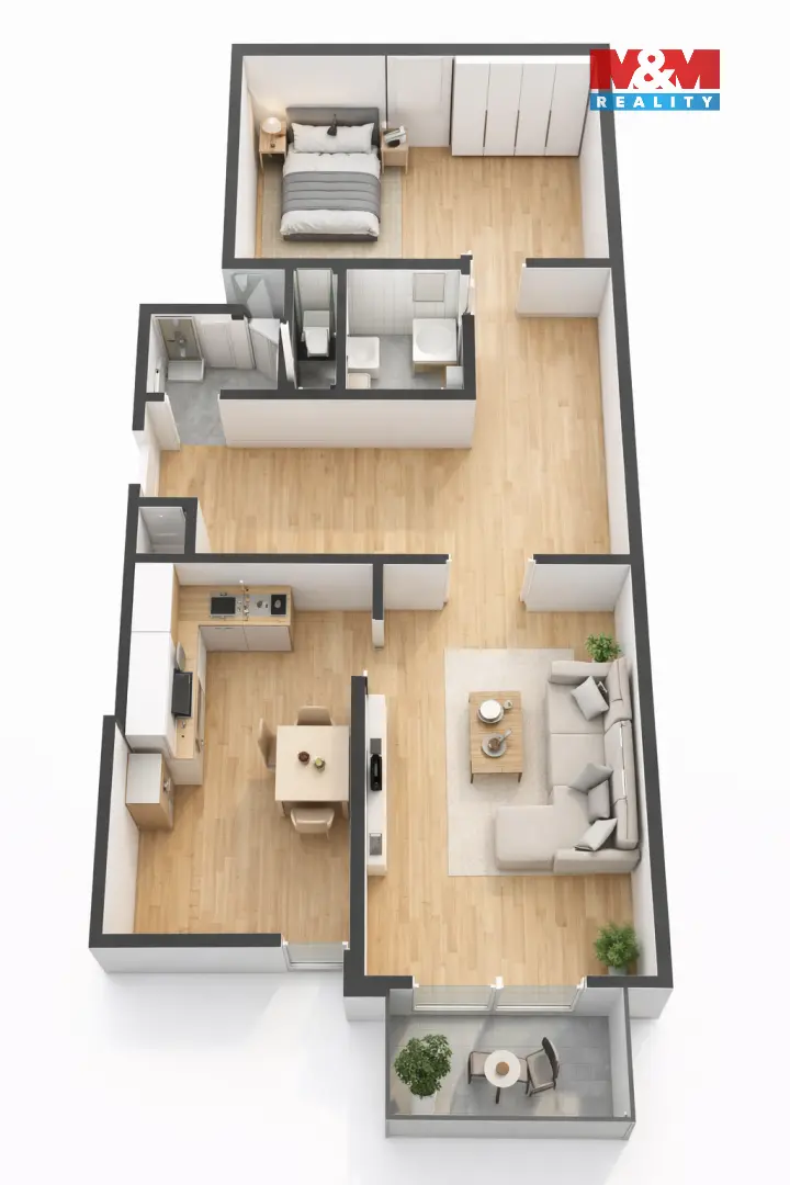 Právě se připravuje rekonstrukce, která promění byt v světlý a moderní prostor. V inzerci proto najdete kromě fotografií současného stavu také vizualizace budoucího řešení, které realisticky ukazují, jak může byt po úpravách vypadat.