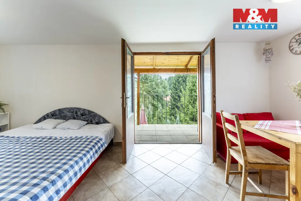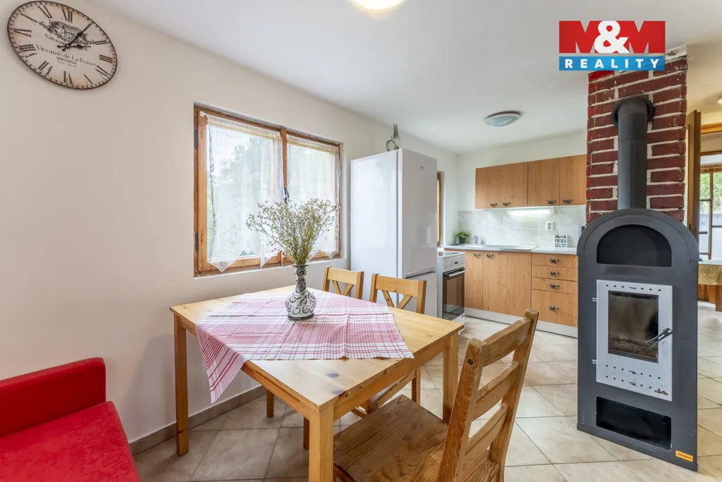 Nabízíme k prodeji útulnou chatu se 2 samostatnými bytovými jednotkami a užitnou plochou 110 m2. V přízemí se nachází větší bytová jednotka s kuchyní, obývacím pokojem s krbovými kamny, balkonem, ložnicí, vstupní verandou, koupelnou se sprchou a WC. V suterénu se nachází menší bytová jednotka se 2 propojenými místnostmi, kuchyní, menší koupelnou a WC. Posezení venku je možné na prostorné terase. Vytápění je zajištěno pomocí přímotopů, krbovými kamny a ohřev vody bojlerem. Zavedena je elektřina, voda z vlastní studny nacházející se na pozemku a odpad je sváděn do septiku. Jedná se o nemovitost v dobrém technickém stavu, kompletně vybavená, připravená k okamžitému užívání, která nabízí zázemí, dostatečný prostor pro pohodlnou rekreaci. Nepropásněte jedinečnou příležitost vlastnit tento kousek ráje v srdci přírody, nacházející se v malebné krajině blízko Slapské přehrady.