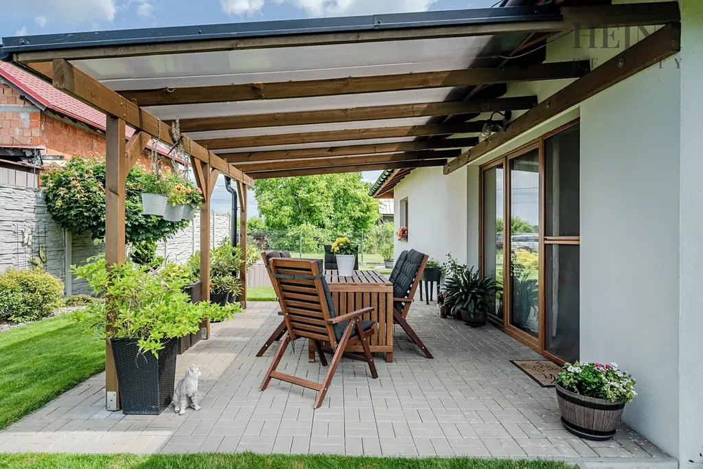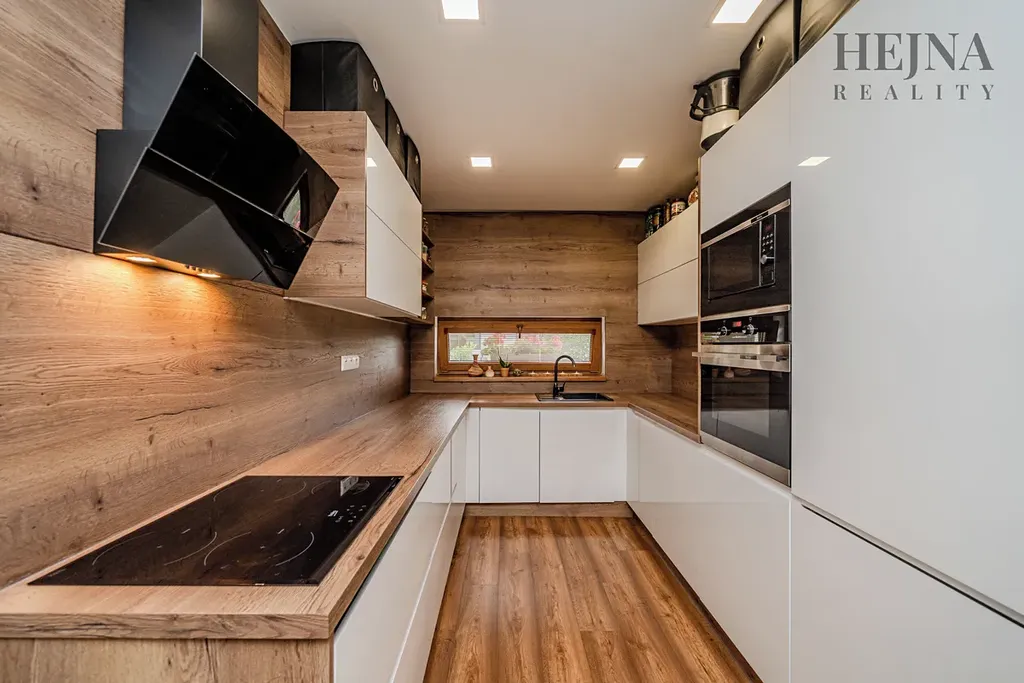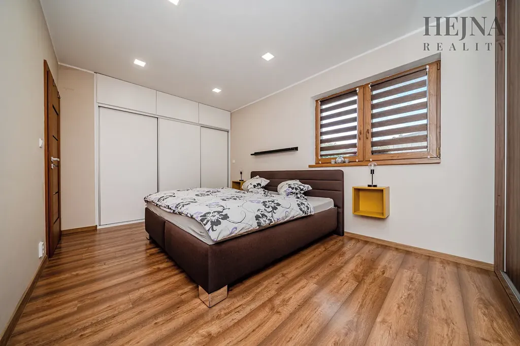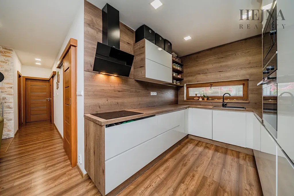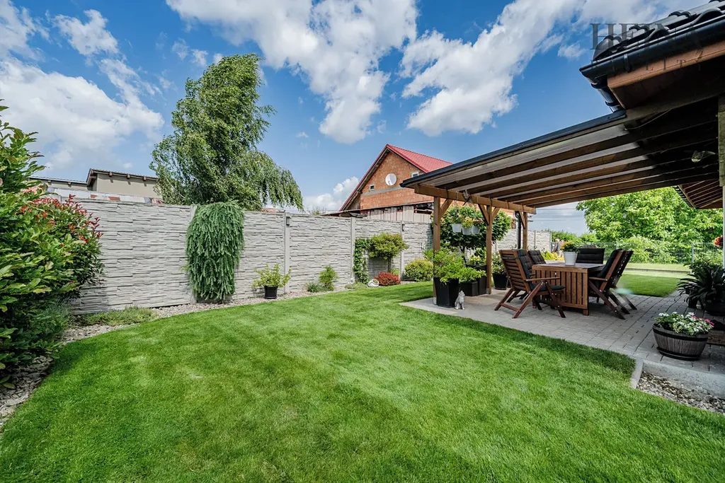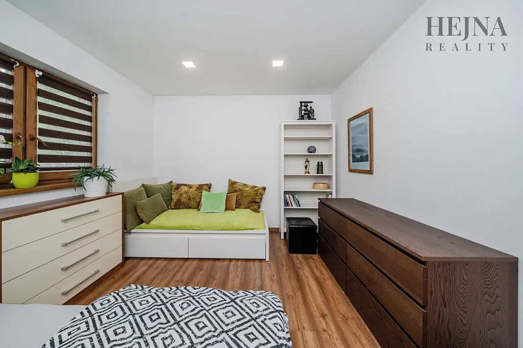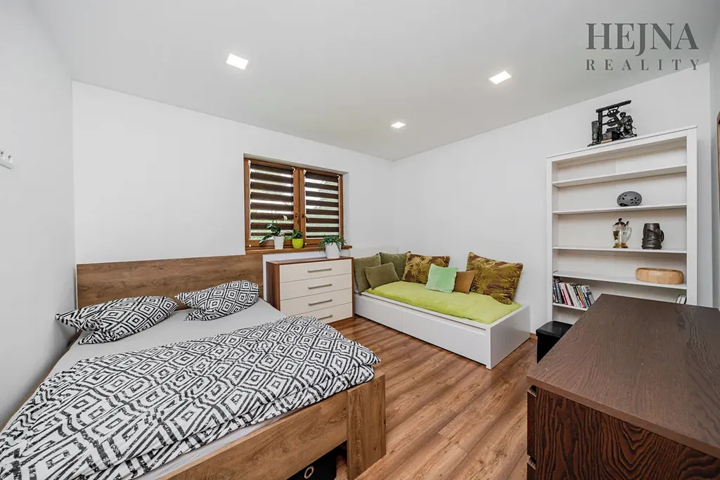 Dispoziční řešení je praktické a nabízí komfortní každodenní užívání. Kuchyňská linka je vyrobena na míru a včetně spotřebičů je součástí prodeje. V chodbě i ložnici jsou vestavné skříně, které poskytují dostatek úložného prostoru. Koupelna je vybavena vanou, sprchovým koutem i WC. Z chodby je vstup do technické místnosti, kde je umístěno technické zázemí včetně prostoru pro kotel. Na obytný prostor navazuje zastřešená terasa, která nabízí příjemné posezení. Vytápění je řešeno kombinací elektrického podlahového topení a krbových kamen, která bez problémů vytopí celý obytný prostor a zároveň vytvářejí příjemnou atmosféru. Konstrukčně je dům zděný z cihelných bloků Heluz tl. 240 mm a zateplený kontaktním fasádním systémem s izolantem EPS 70 o tloušťce 200 mm. Okna jsou plastová, šestikomorová, s izolačním trojsklem. Střecha je valbová se sklonem 25°, konstrukčně řešená jako dřevěný krov. Dům je napojen na veřejný vodovod, odpad je řešen septikem s vývozem. Dešťová voda je svedena do vrtu. Pozemek je celooplocen, což zajišťuje dostatek soukromí i bezpečí. Součástí exteriéru je přístřešek pro 2 až 3 automobily a zahradní domek určený k uskladnění nářadí a zahradního vybavení. Zahrada je pečlivě udržovaná, osázena okrasnými stromy a keři, prakticky členěná a nenáročná na údržbu.