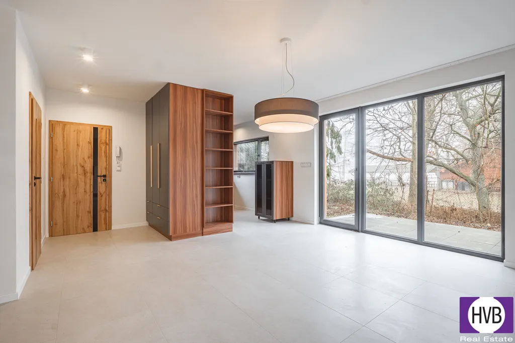 V přízemí se nachází prostorný obývací pokoj se vstupem na terasu a zahradu, plně vybavený kuchyňský kout (varná deska, digestoř, myčka, lednice) a koupelna se sprchovým koutem a WC. Nechybí technická místnost a dostatek úložného prostoru.