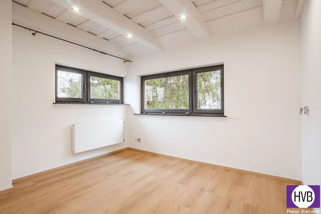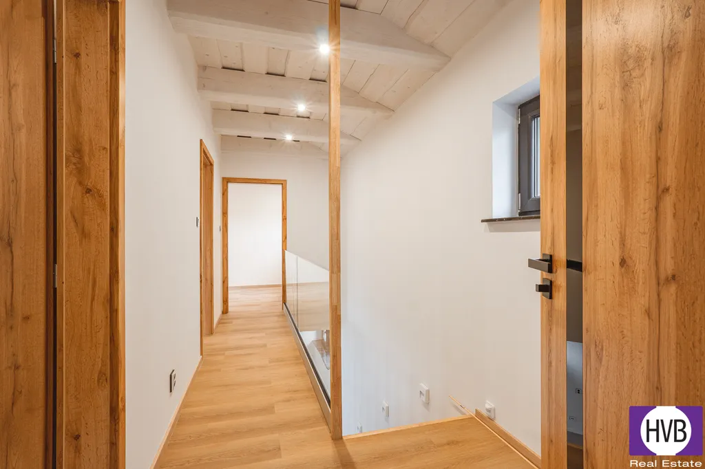 V patře je ložnice, dva další pokoje a druhá koupelna s vanou, sprchovým koutem a WC.