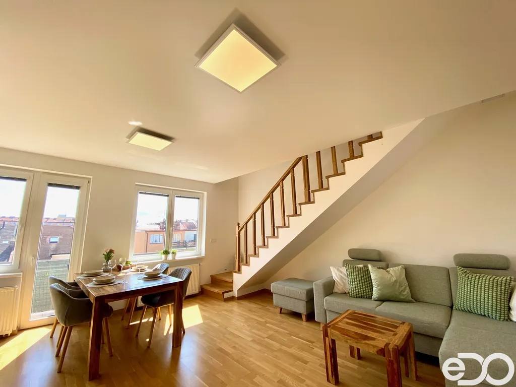 Byt je plně zařízený – k dispozici je moderní kuchyňská linka se spotřebiči, jídelní stůl, sedací souprava, postele i úložné prostory. Dispozice bytu zahrnuje prostorný obývací pokoj s kuchyňským koutem, dvě ložnice, koupelnu se sprchovým koutekm a samostatné WC. Z obývacího pokoje je přímý vstup na balkon, který nabízí příjemné místo k odpočinku.