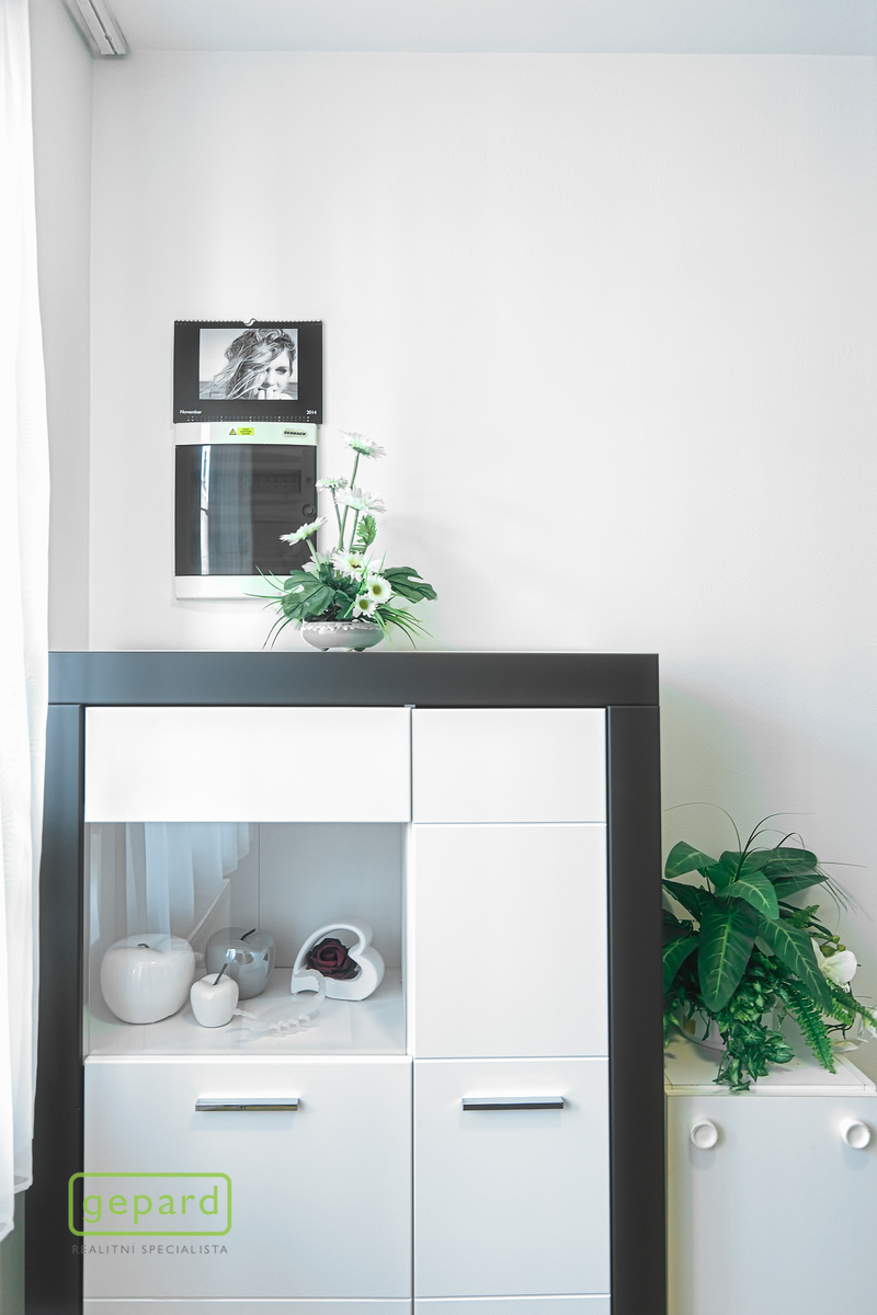 V bytě jsou nové plovoucí podlahy, dveře, designová kuchyňská linka se spotřebiči, plastová okna, koupelna se sprchovým koutem.