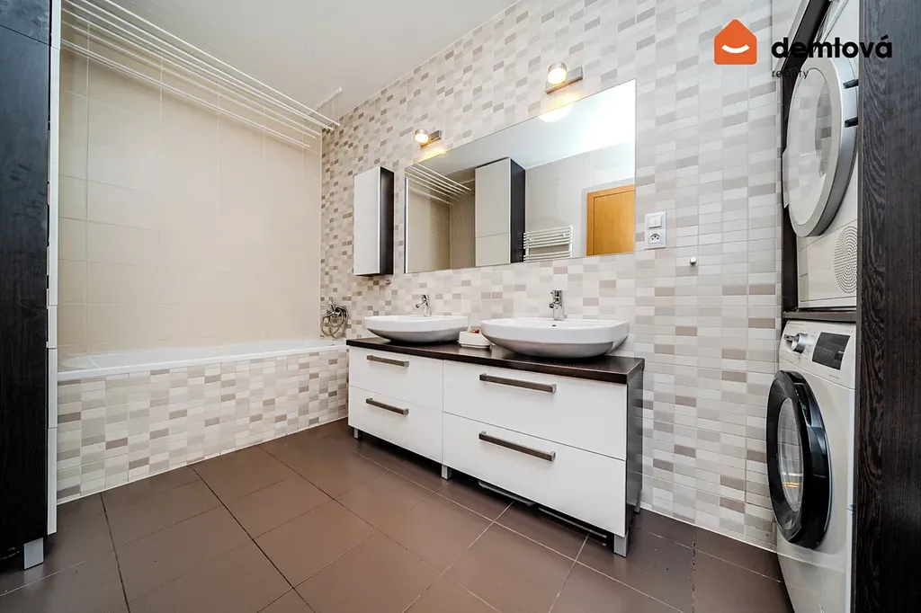 • hlavní koupelnu s vanou, dvěma umyvadly a toaletou,