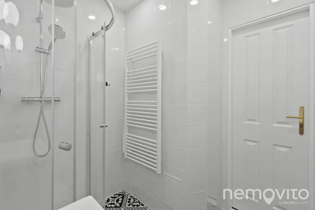 Koupelna disponuje sprchovým koutem a umyvadlem s praktickou úložnou skříňkou. Komfort zde zajišťuje elektrické podlahové vytápění, výtopný žebřík a ohřev teplé vody elektrokotlem.