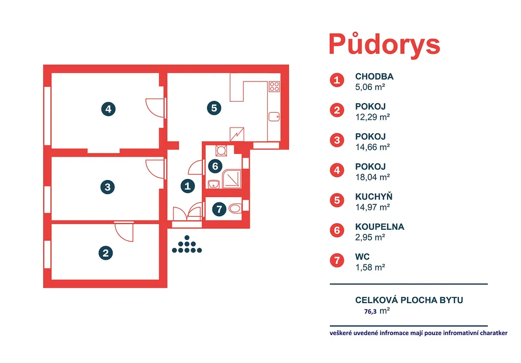 Dispozice 4+kk nabízí tři plnohodnotné pokoje (18,04 m², 14,66 m² a 12,29 m²) a samostatnou prostornou kuchyň o velikosti 14,97 m².