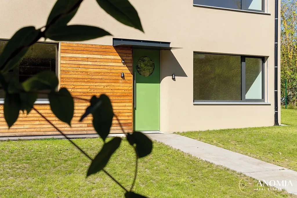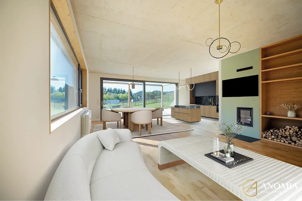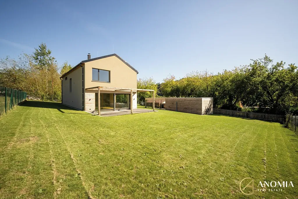 Užitná plocha interiéru cca 157 m² (bez terasy a příslušenství); dům celkem cca 196 m². Z obývací části je bezschodový vstup na modřínovou terasu 39 m². Dále dílna + sklad 40 m² a kryté parkování 39 m² pro 2 vozy se zelenou střechou. Pozemek 1 062 m² se soukromím a ideální orientací ke slunci.